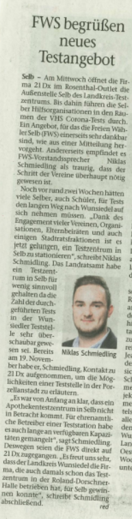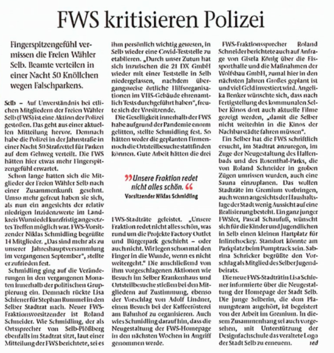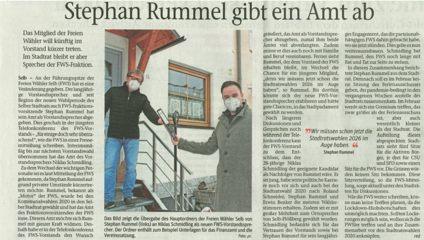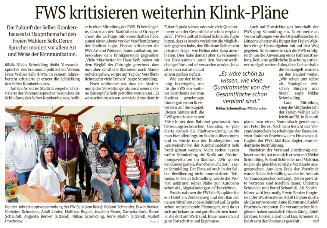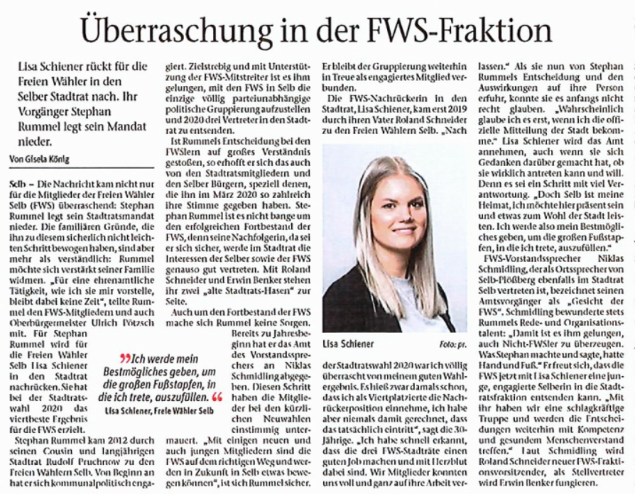 Zum Hintergrund: Die FWS sind eine parteifreie, unabhängige Wählergruppe und gehören nicht der Landesvereinigung der Freien Wähler Bayern an. Derzeit gehören aus den FWS-Reihen Roland Schneider, Erwin Benker und Lisa Schiener dem Selber Stadtrat an. Zudem stellt die Gruppierung drei Ortssprecher: Thomas Rohstock, Bernd Schaufuß und OB-Kandidat Niklas Schmidling.