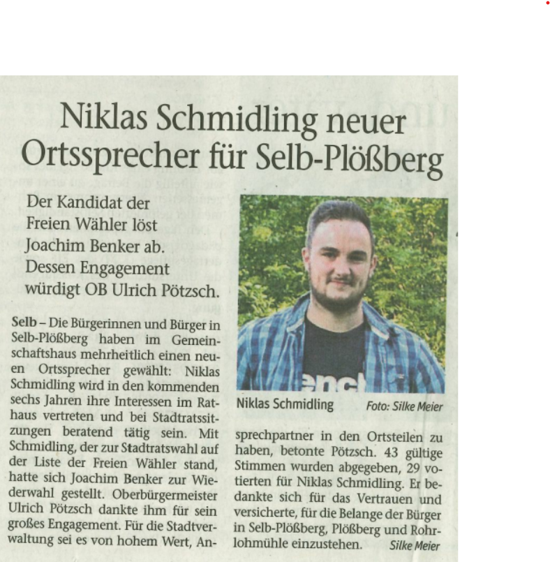 Jetzt haben auch die Freie Wähler Selb (FWS) Anspruch auf den Chefsessel im Rathaus der Porzellanstadt angemeldet: Niklas Schmidling hat am Donnerstagabend bei der Nominierungsversammlung im Vereinsheim der Waldfreund-Schützen im Ortsteil Reuth seine Kandidatur erklärt.