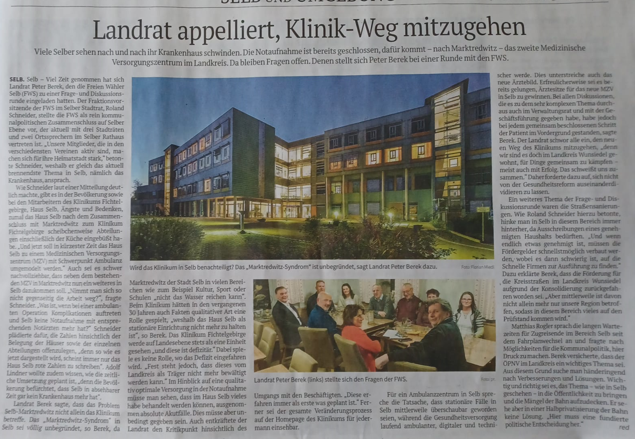Der Vorstandssprecher ging weiter auf eine Diskussionsrunde im März 2024 mit Landrat Peter Berek ein, zu der die Freien Wähler Selb damals eingeladen hatten. Laut Mitteilung habe sich Berek viel Zeit für die FWS gelassen. FWS-Stadtrat Roland Schneider hatte damals als Moderator durch den Abend geführt. Die FWS kritisierten, dass das Klinikum Selb scheibchenweise nach Marktredwitz „abgewandert“ ist. Immer mehr Abteilungen hätten sich in der Nachbarstadt angesiedelt. Zudem hatten die FWS auch ein Problem mit den Zahlen des Hauses in Selb, da, wie es in der Presse dargestellt, immer nur das Klinikum in Selb rote Zahlen geschrieben habe. Peter Berek erklärte den FWS, dass das sogenannte „Marktredwitz-Syndrom“ völlig unbegründet sei und Marktredwitz der Stadt Selb in vielen Punkten, beispielweise Kultur, Sport oder Schulen, nicht das Wasser reichen könne. Leider konnte der Landkreis das Klinikum in Selb nicht mehr weiter bewilligen, da die Einheit, zusammen mit dem Klinikum Marktredwitz, als defizitär angesehen wurde.